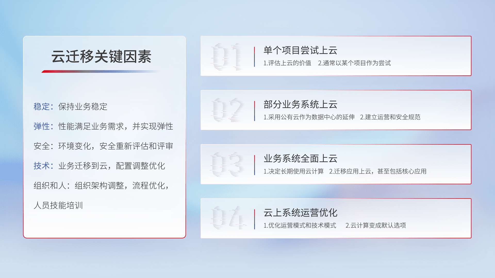 结合实际业务,,从规划设计、、、、云平台选型、、、、云原生改造、、数据迁移、、、、集成交付,,,迁移全过程为客户识别最佳上云路径,,,做好风险识别管理,,,设计网络架构、、、、身份权限、、、安全审计合规、、、操作审计、、、日志审计、、、监控告警策略、、、、多站点容灾设计等,,,对云上基础设施进行整体规划,,,,提升IT治理水平,,,,以满足弹性、、、、高可用、、高性能的需求。。