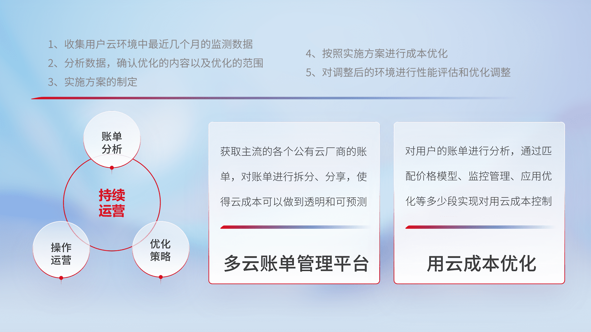 通过多云纳管,,以统一的资源数据模型把客户的云资源进行抽象和封装,,进而实现对多云资源的统一操作,,,保障云资源管理的可靠性、、稳定性与可用性。。量身定制化运维内容,,,,配置、、开发运维、、补丁管理、、、备份、、、监控、、、、认证和访问管理、、、审计和日常巡检等,,,,保障在用云过程中的可靠度,,稳定度以及高可用率。。。。
